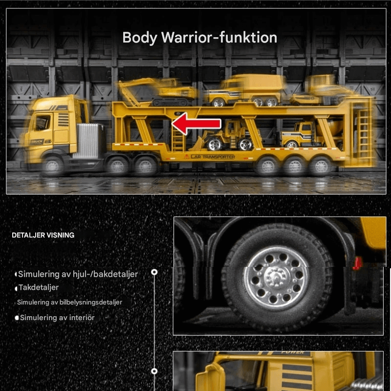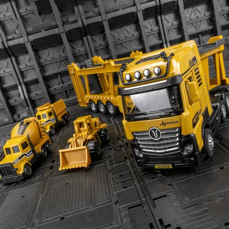 Innehåller Dubbeldeckare trailer lastbil, Bulldozer, Tippbil, Lastbilsmixer, Väghjul