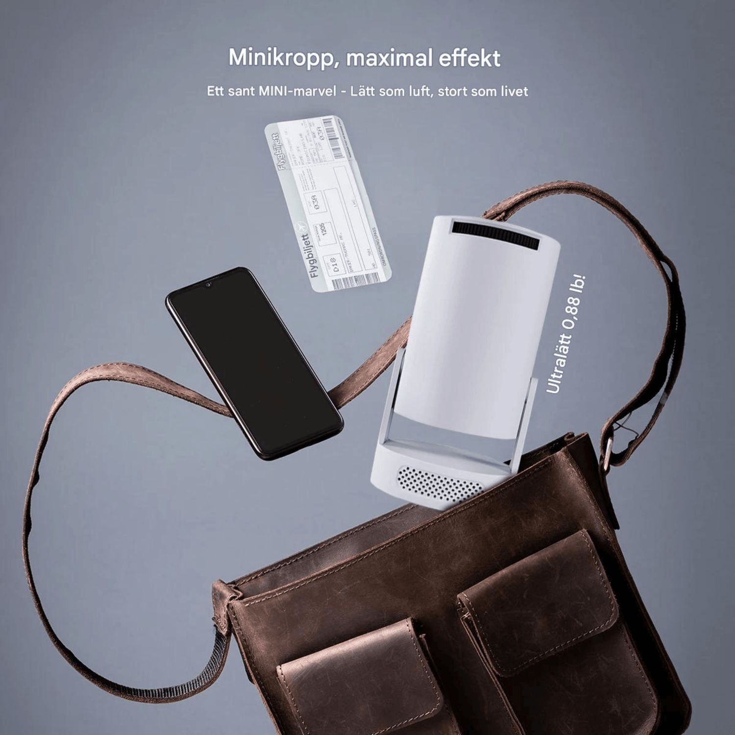 Projektoren er mindre end mange mobiltelefoner og kan nemt passe på små overflader. Med 180° roterbart design kan du projicere mod væg, bordplade eller loft, hvilket kan skabe flere anvendelsesmuligheder både hjemme og på rejser.