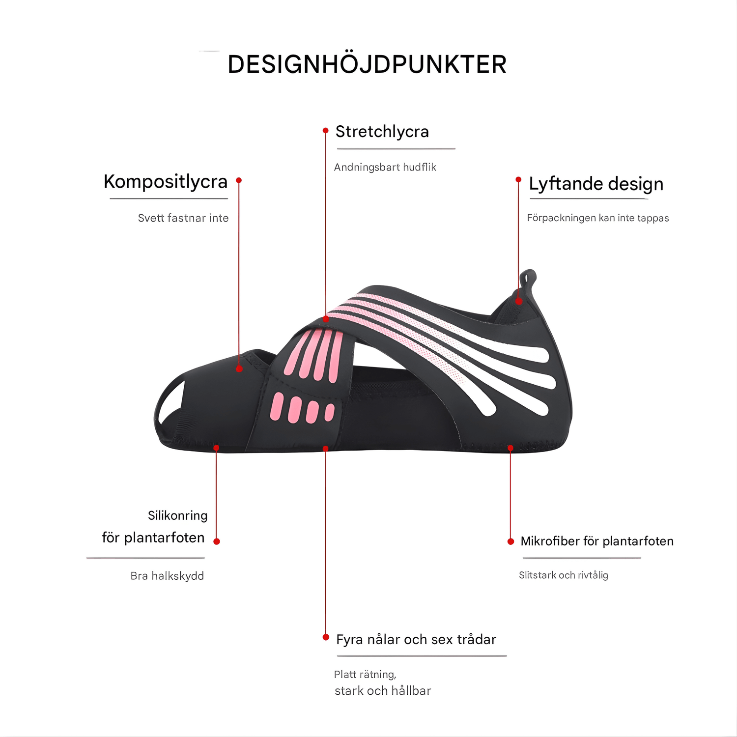 FlexStep er designet til at give let og behagelig støtte til foden, samtidig med at de hjælper med at forbedre greb og balance under forskellige træningsformer. Den tynde lycra-struktur kombinerer fleksibilitet og åndbarhed