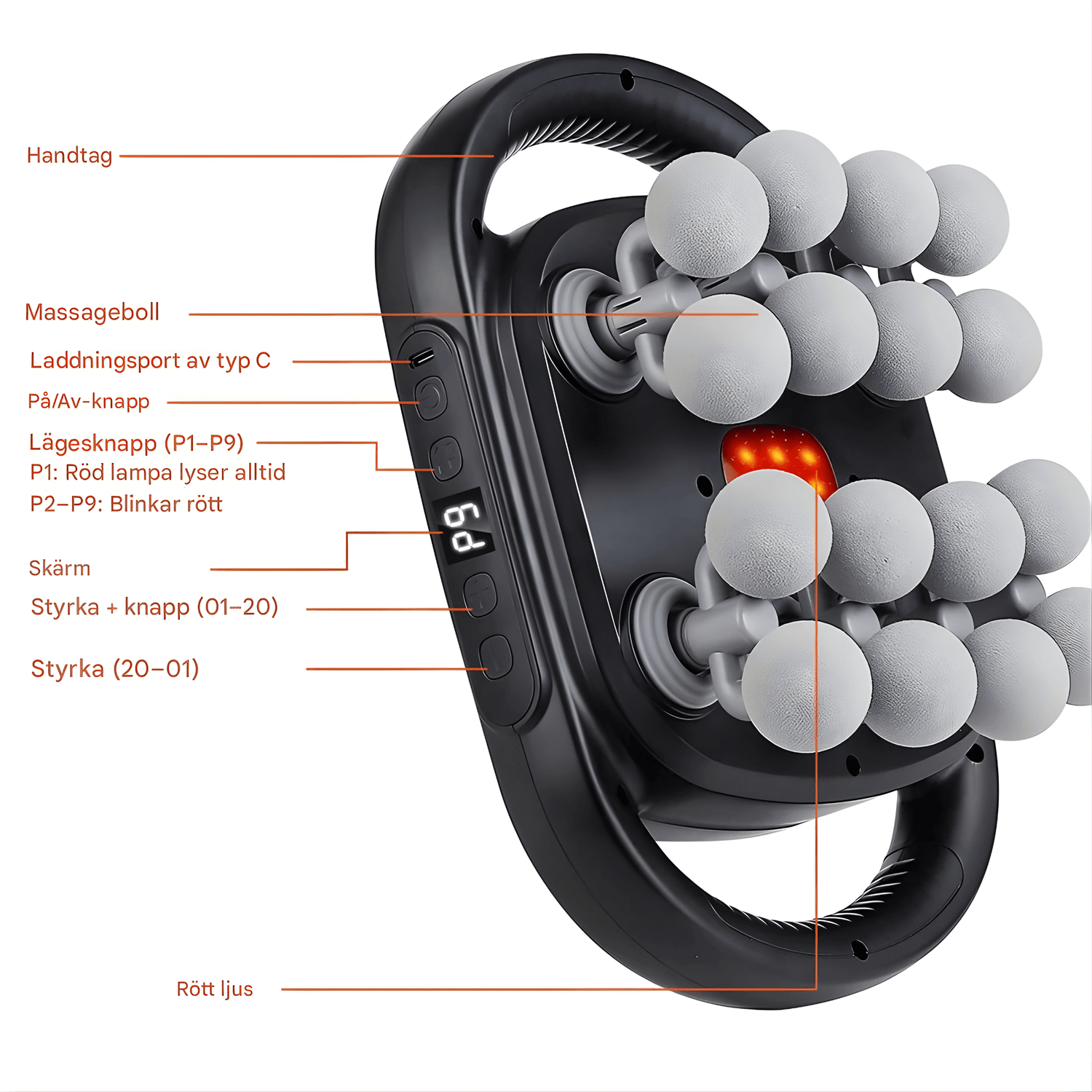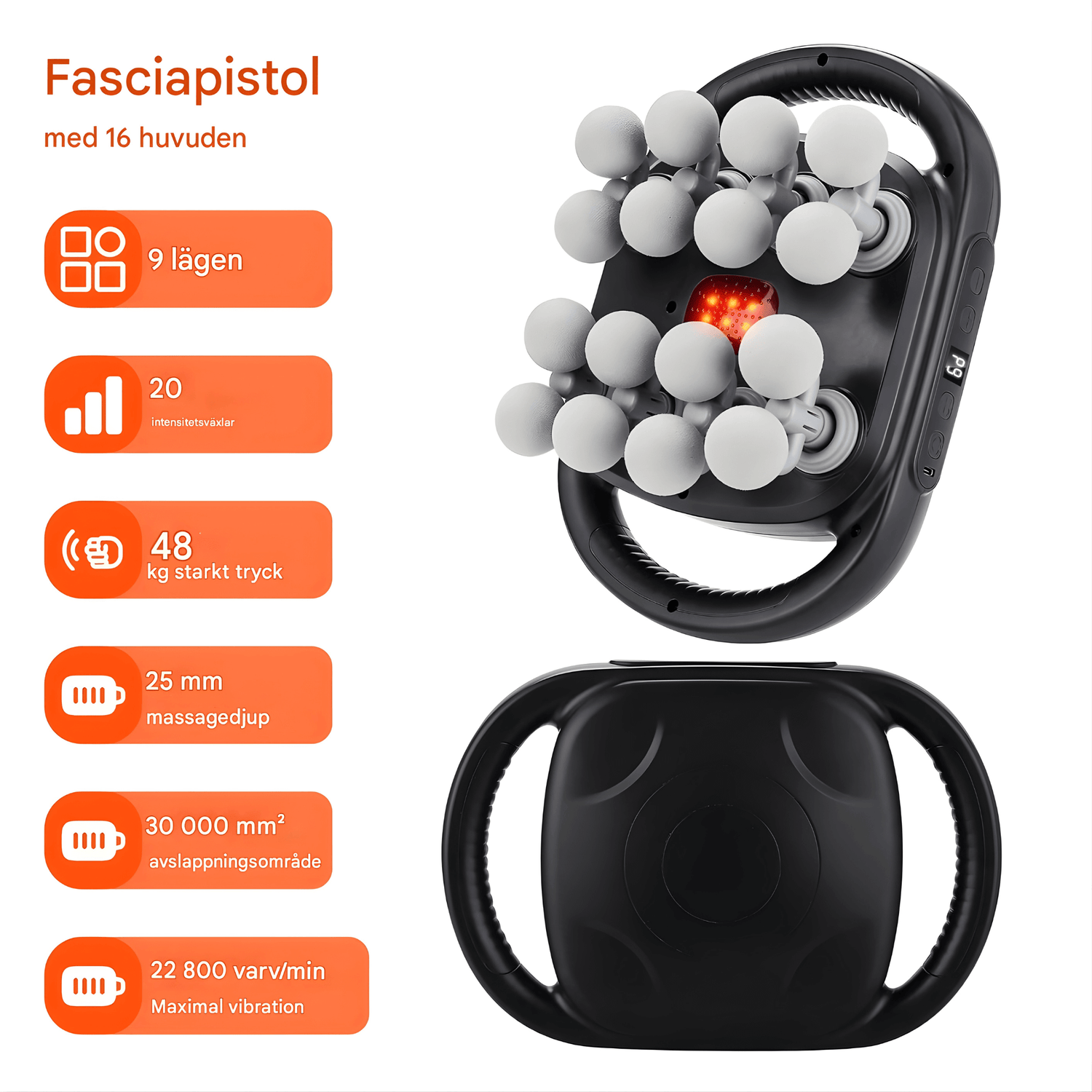 - 💆 16 udskiftelige massagehoveder - kan tilpasses til forskellige muskelgrupper