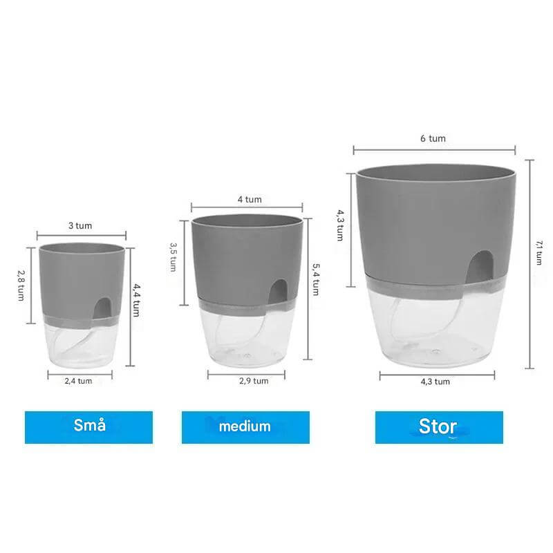 - Självvattnande kruka – upp till 15–20 dagar utan påfyllning