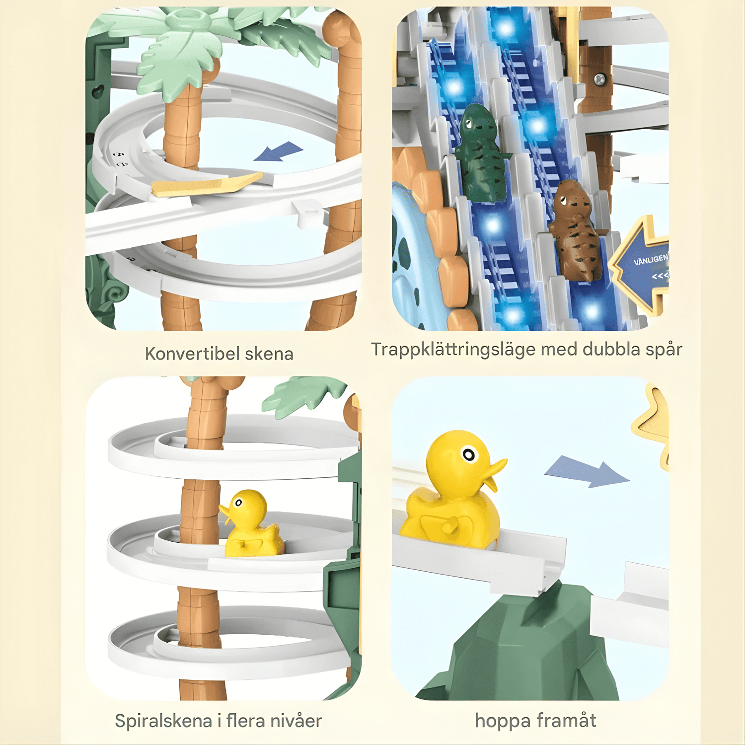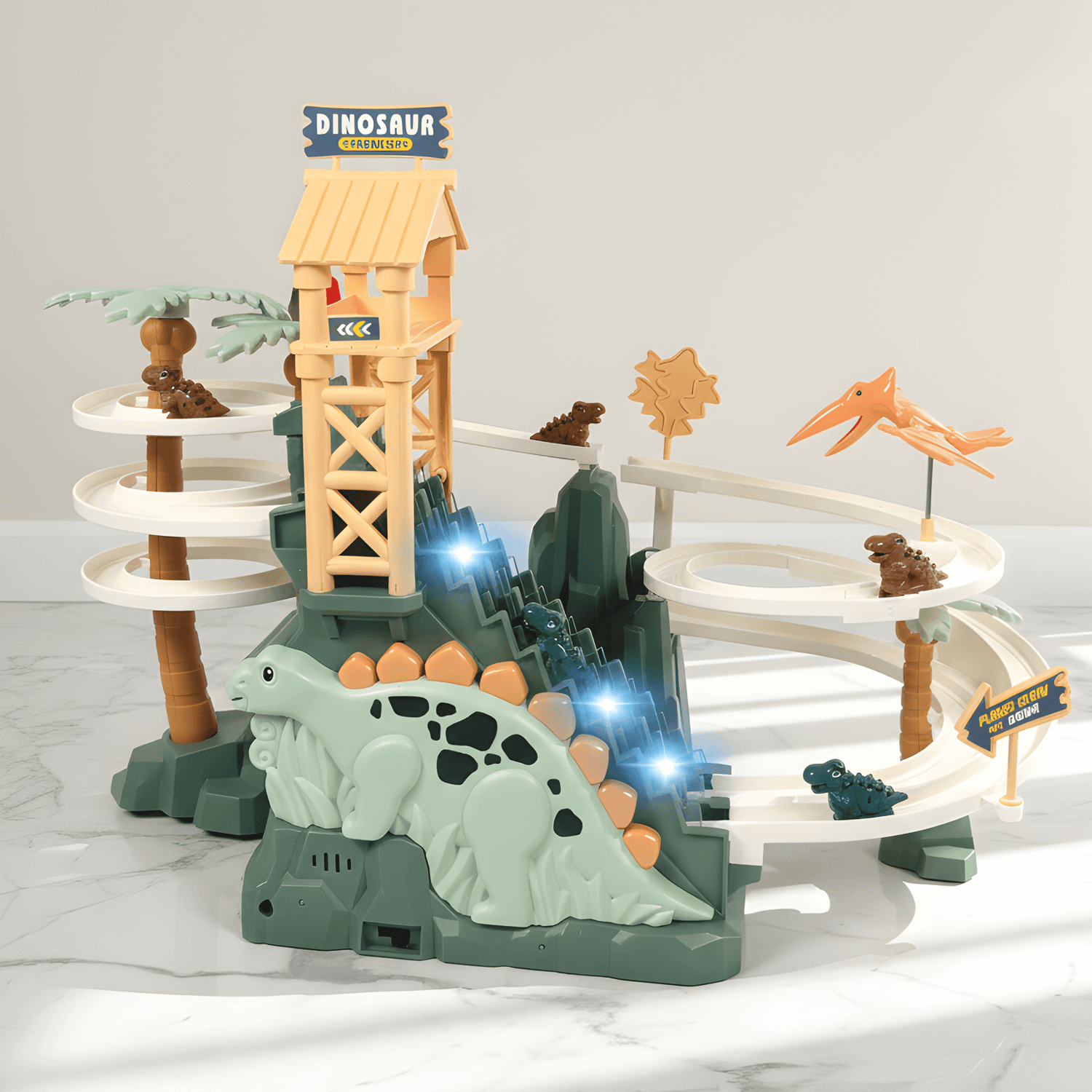 DinoTrack - Electric Double Track Dinosaur Slide with Dynamic Climbing Stairs, Lights & Music for Kids